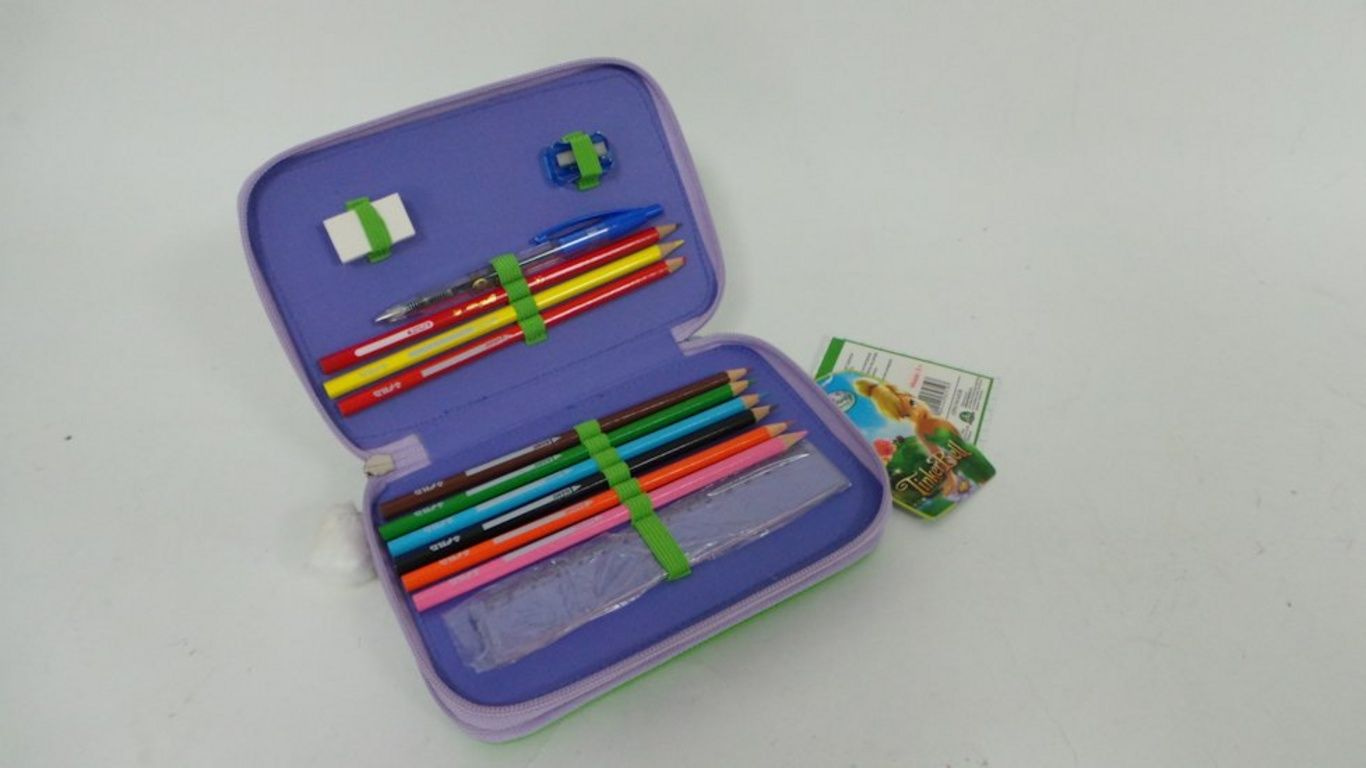 O conteúdo inclui canetas, lápis, borracha, régua, etc pountenslijper