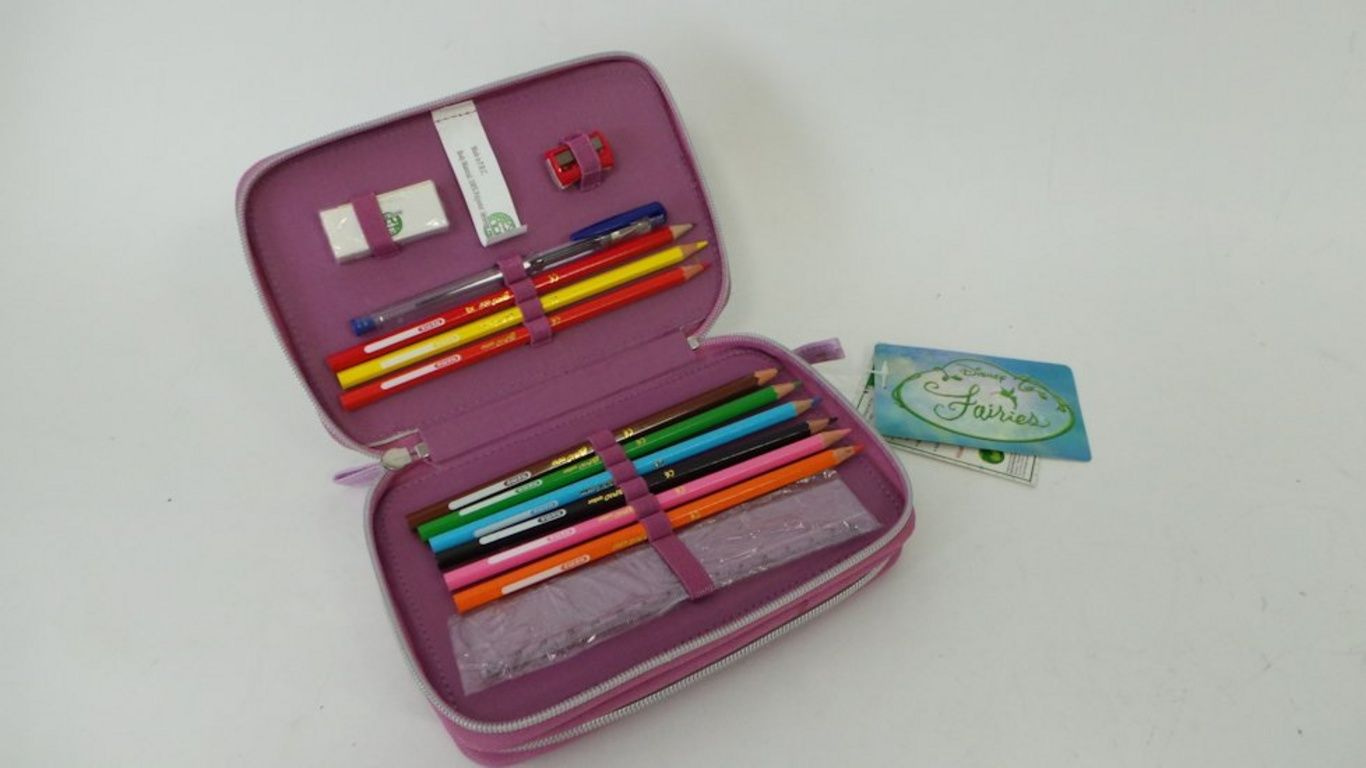 O conteúdo inclui canetas, lápis, borracha, régua, etc pountenslijper