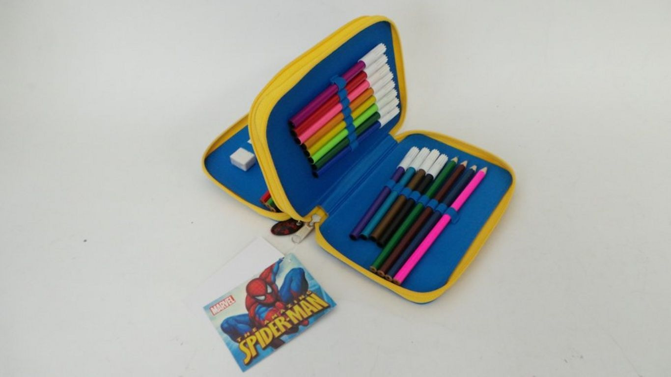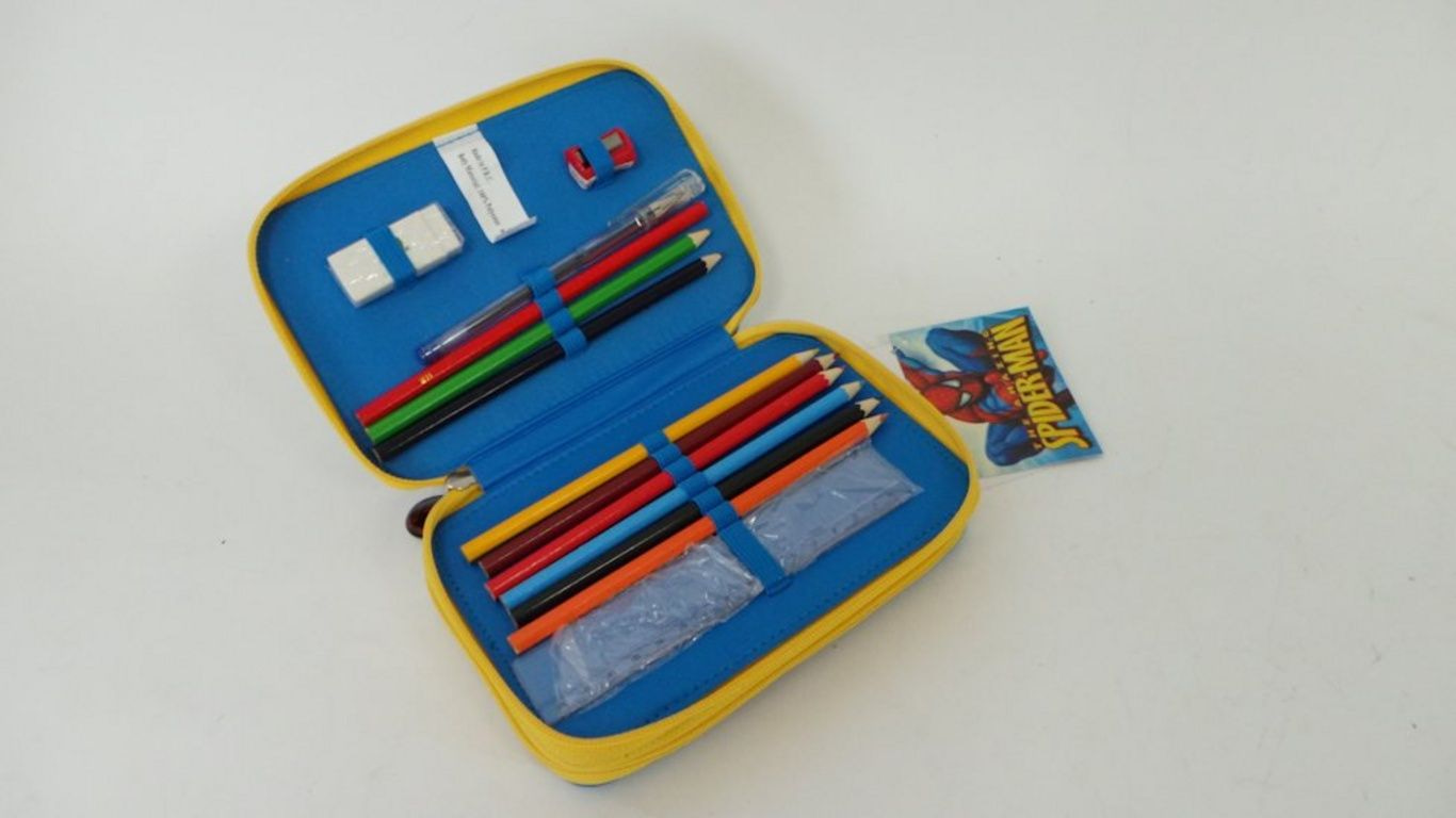 O conteúdo inclui canetas, lápis, borracha, régua, etc pountenslijper