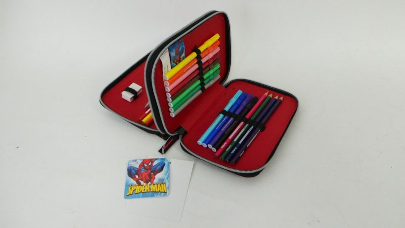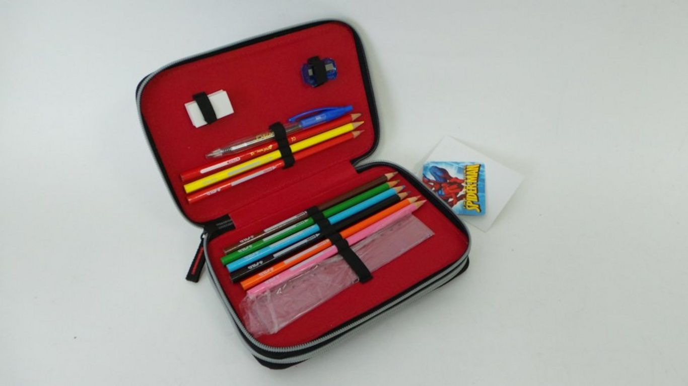 O conteúdo inclui canetas, lápis, borracha, régua, etc pountenslijper