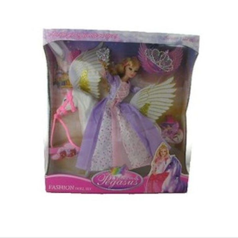 Conteúdo da caixa: princesas pop e um grande cavalo branco Pegasus e muitos acessórios.