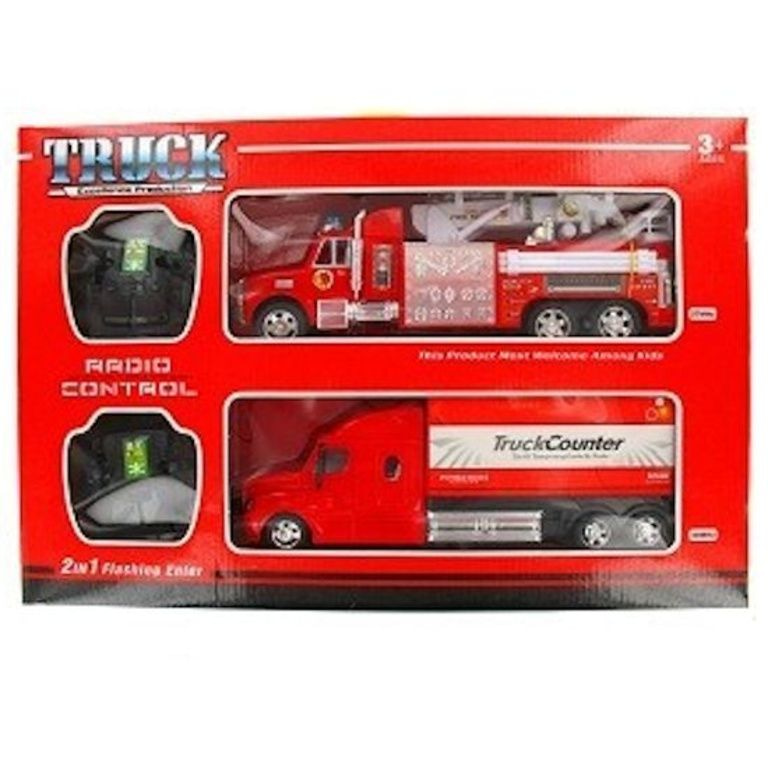 Dois caminhões controlados por rádio, 1x e 1x caminhão. Configurá-los em dois canais diferentes e competem entre si.