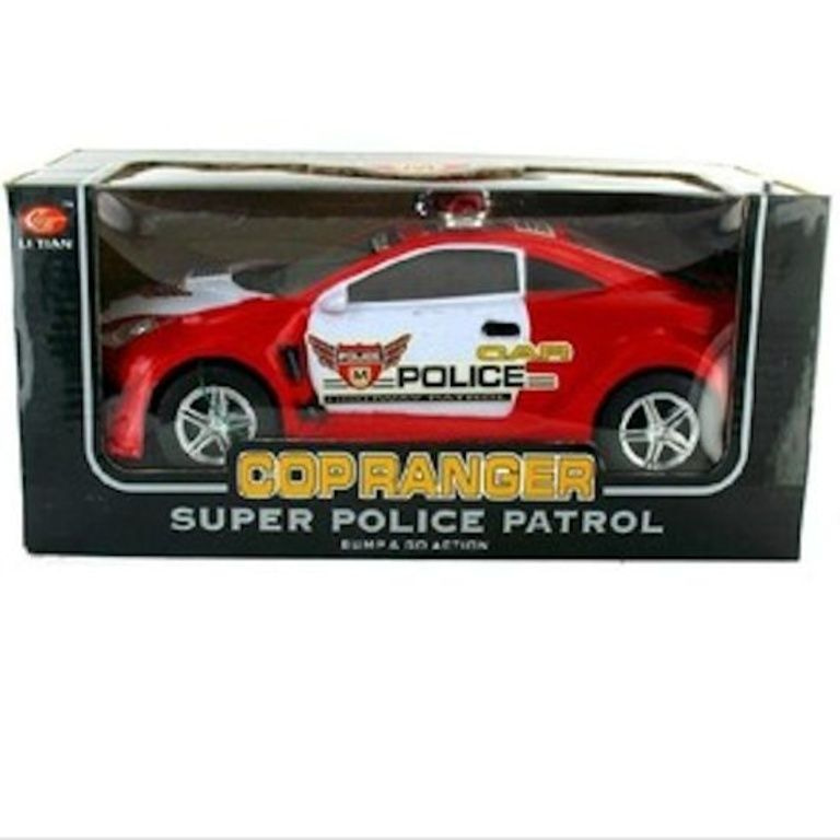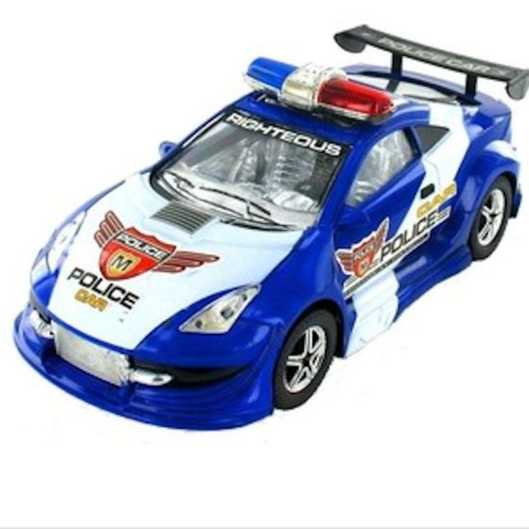 Este carro da polícia dirige-se ao redor, uma vez que ele bateu em alguma coisa bots ele dirige o outro lado. com luz e som.