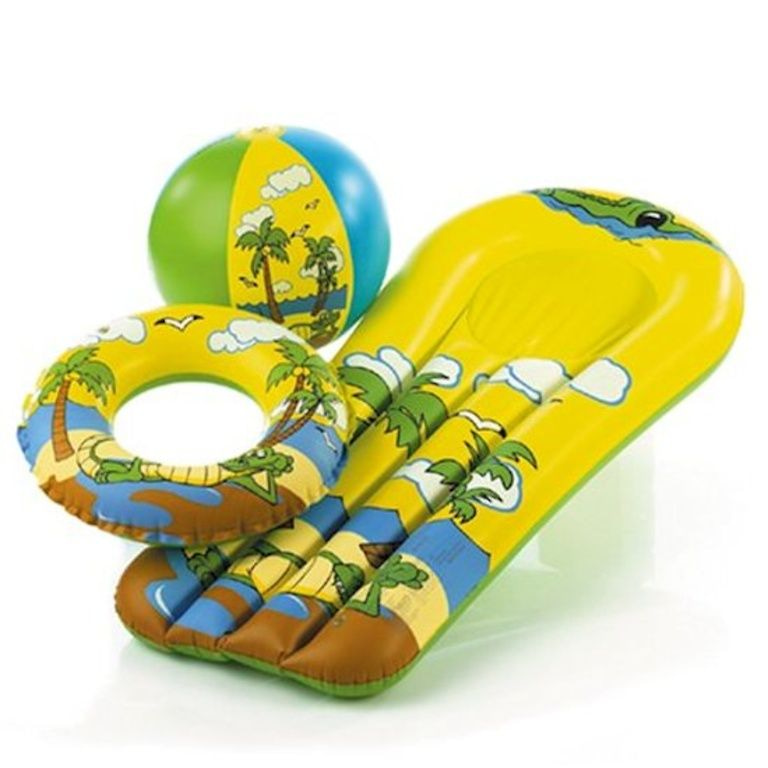 Colchão de ar, bola de praia e anel inflável.