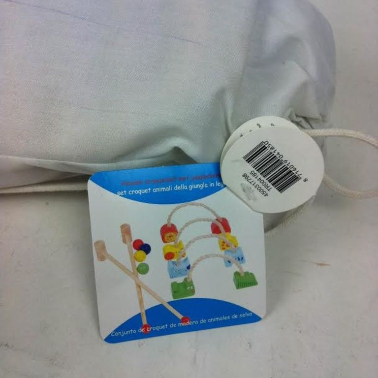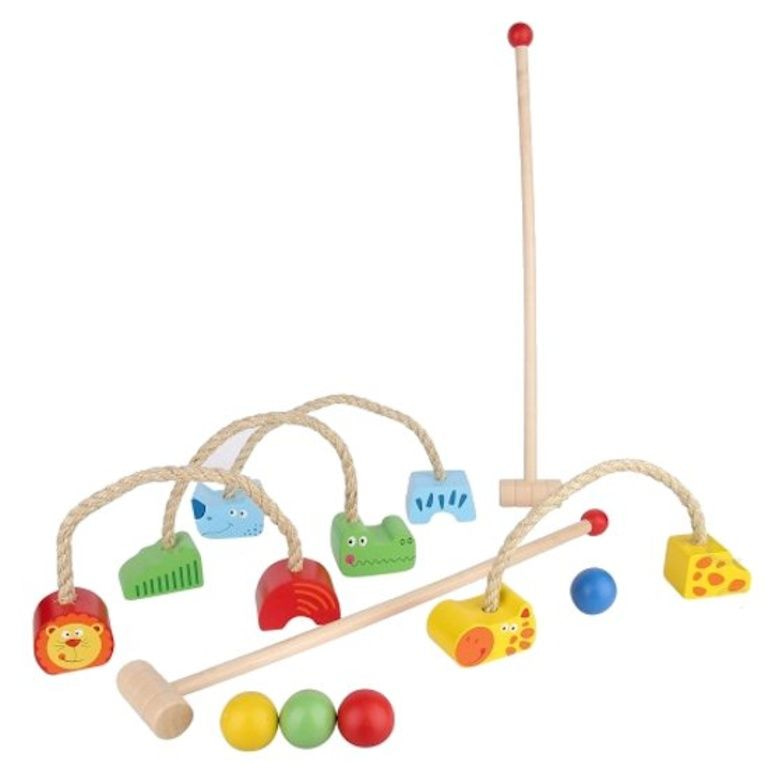 Alegre madeira Croquet Playset, com animais da selva felizes.