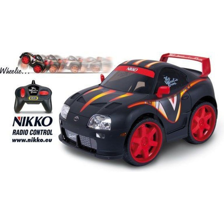 Nikko Wheelie Bros Toyota. Este carro rádio resistente pode fazer Wheelies reais! Freqüência de RF de 27 MHz, com funções de condução completos. Pilhas incluídas (1x e 4x 1.5V 9V pilhas AA). Embalado em um windowbox.
