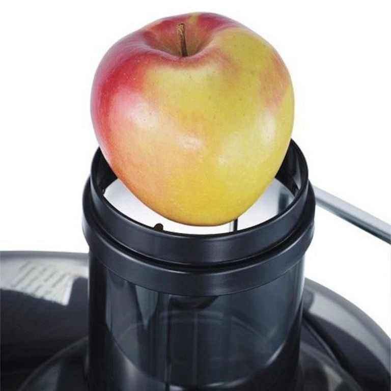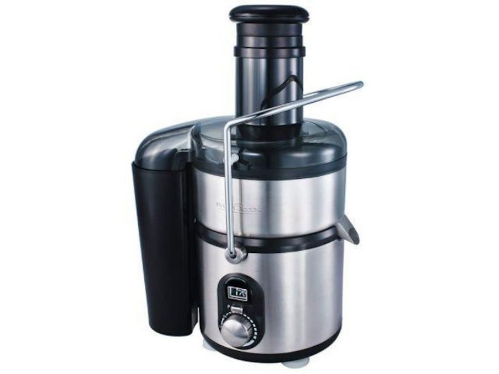 AE1001 juicer profissional com caixa de aço inoxidável. Pesado, motor durável Vida Profissional Long, max.1200 Watt. 9 velocidades ajustáveis para frutas macias e duras, incluindo a função turbo. Abertura de enchimento extra larga (75 mm). Pressione sem reduzir maçãs inteiras, cenouras e outras frutas em segundos.