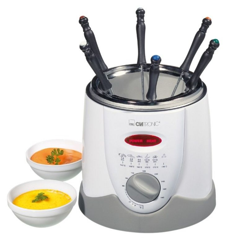cesta com alça destacável, 6 garfos de fondue (colorida) e anel de proteção. Odor substituível e graxa. Ajustável termostato e proteção contra superaquecimento. Conteúdo: 1 l. Potência: 900 W.