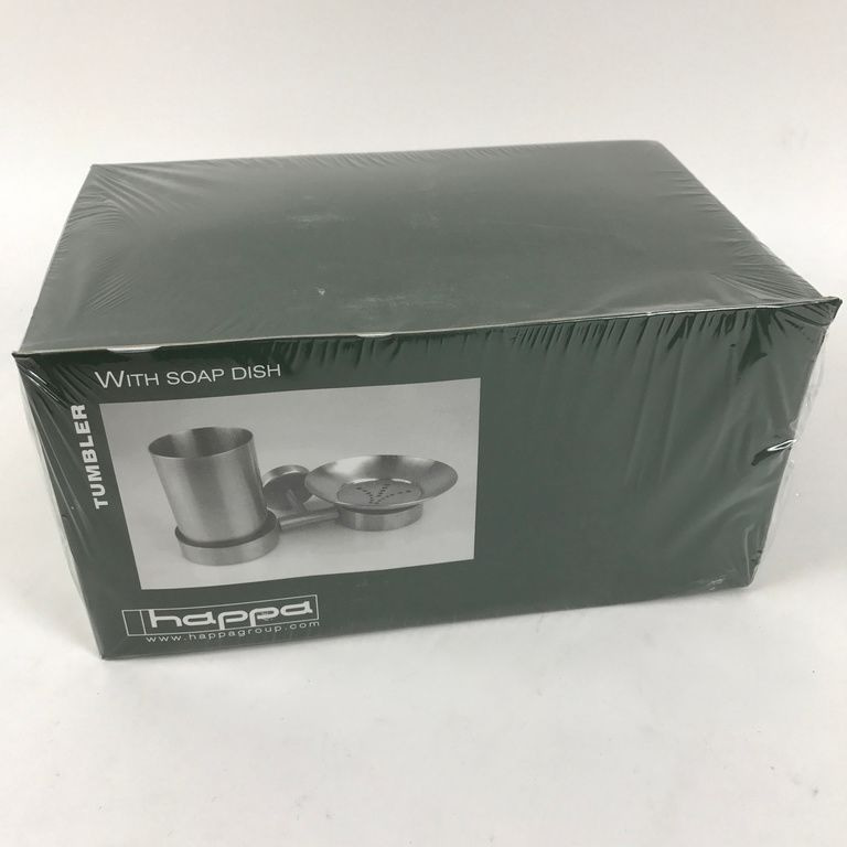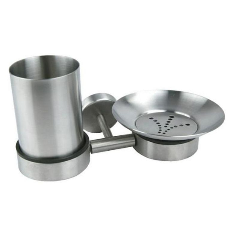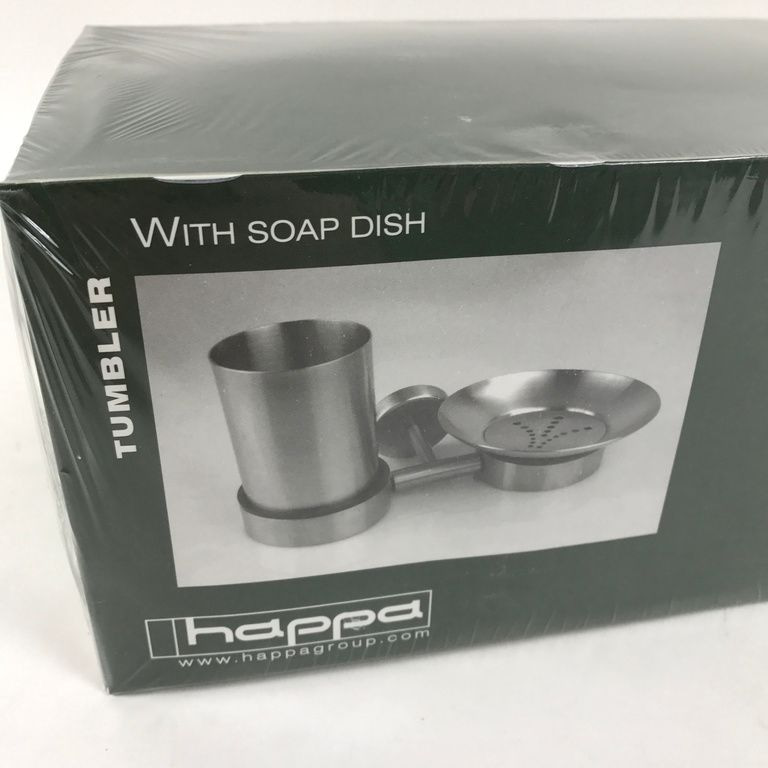 Banho Cup & Suporte do sabão. Esta casa de banho set Happa inclui uma placa de aço inoxidável com montagem na parede. Esta montagem de parede é colocado um copo para escovas de dentes, pasta de dentes e outros atributos. Além disso, não está ligado a placa para a realização de sabão solto no lugar. O conjunto é feito de aço inoxidável de alta qualidade.