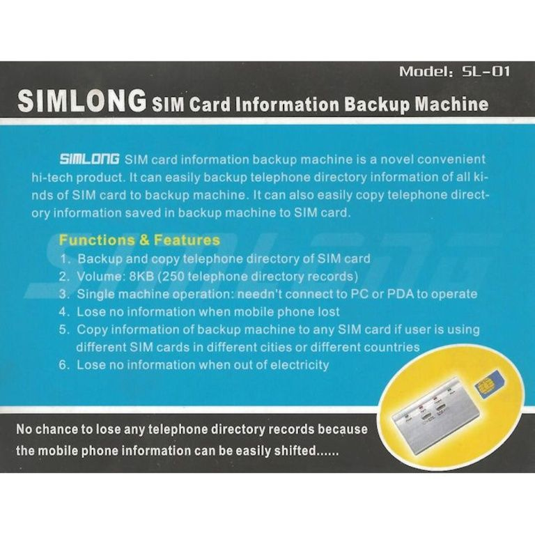 A máquina de backup informações do cartão Smart Card Sim é um produto acessível oi-tech. Ele simplesmente faz um backup da sua lista telefônica (nomes e números de telefone) em seu telefone móvel. Este informações de diretório do seu celular é então armazenada no Smart Card.