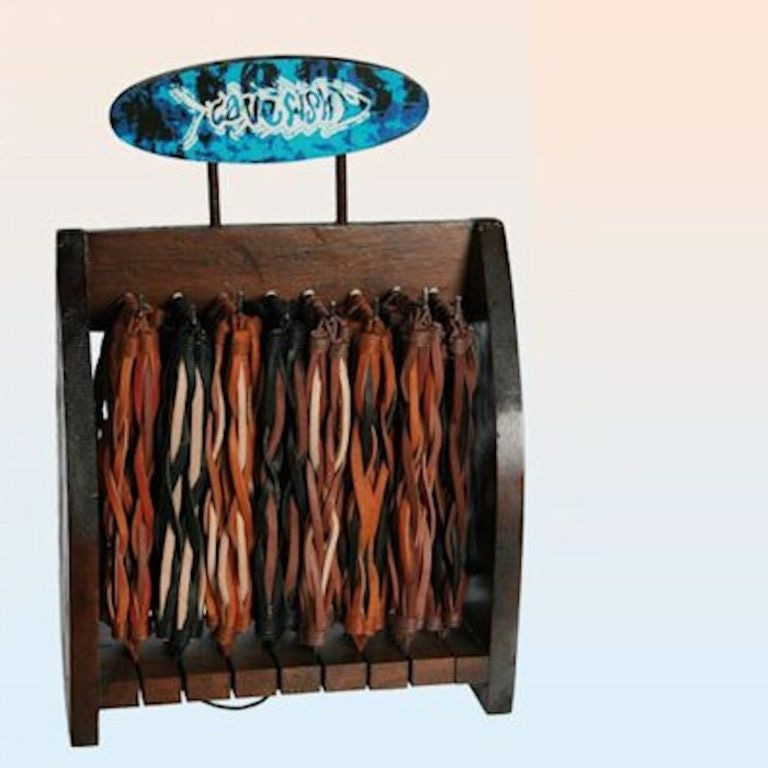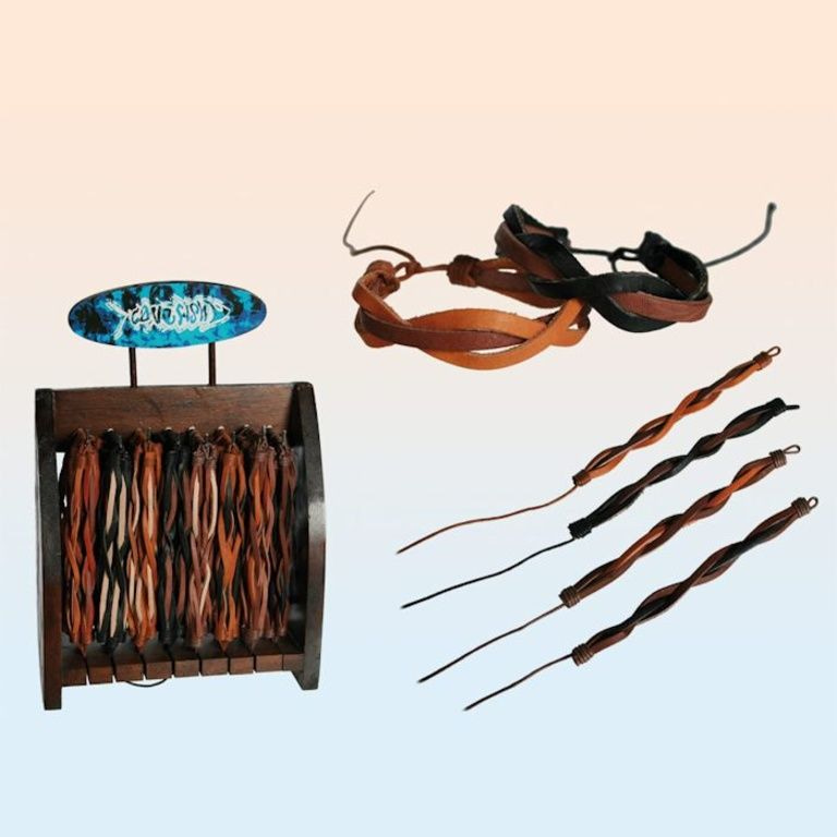 Cada display contém 96 peças e 8 tipos diferentes de pulseiras de couro trançado.