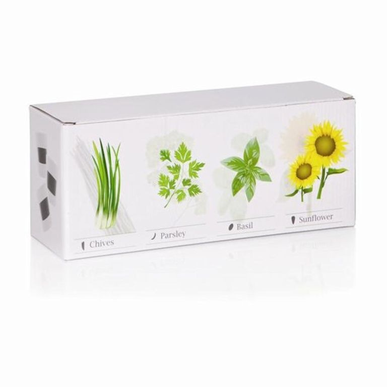 Jogo de 3 potes de cerâmica com ervas superfície do quadro. Incluindo giz, o solo e sementes de salsa, cebolinha, manjericão e sementes de girassol.