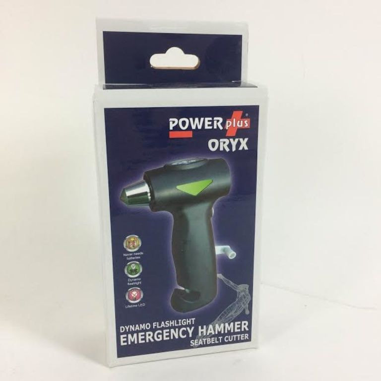 O Oryx é um martelo de emergência ideal, porque você também tem um cortador de cinto de segurança direta e lanterna dínamo em caso de emergência.